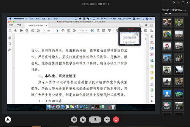 副院长孙健对在疫情防控期间学院科研工作进行了部署,学院科研工作要在符合保密工作规定的基础上,采取信息技术手段加强协同,确保科研工作有序开展,自然基金等项目申报书要反复打磨,安排一对一线上指导,通过线上函审视频交流等形式,听取国内外同行意见和建议,提高申请书撰写质量;同时对学院因公出国(境)团组审批和派出、国际学术会议、国际交流业务等工作进行了部署。