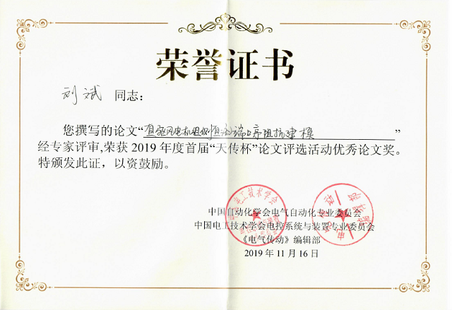 第十九届中国电气自动化与电控系统学术年会暨“智能电气创造未来”高峰论坛由中国自动化学会电气自动化专业委员会(CAAEA)、中国电工技术学会电控系统与装置专业委员会(CESCS)和中国电器工业协会变频器分会联合主办。本次大会的主题是“智能电气创造未来”,旨在促进中国电气自动化与电控系统产业的技术创新和技术进步,促进产、学、研、用之间的合作。来自海内外电气信息技术、自动化、先进制造、智能通讯及相关领域的4位院士(中国工程院院士、东北大学柴天佑教授,中国工程院院士、湖南大学罗安教授,中国科学院院士、华中科技大学丁汉教授,中国工程院院士、海军航空大学何友教授)、20余位长江学者、国家杰青等杰出学者、500余名国内外科技工作者出席大会。大会上开展了6个专题论坛、46个特邀专题报告。本次会议特设“天传杯”优秀论文评选活动,经各专题主席的推荐和评选,最终择优评选出8位“天传杯”优秀论文获得者,获奖学生主要就读于清华大学、哈尔滨工业大学、北京理工大学等国内一流工科高校。最终本论文因其在海上直流汇集方式风电场阻抗建模及稳定性分析方面的贡献而获得最佳论文奖。