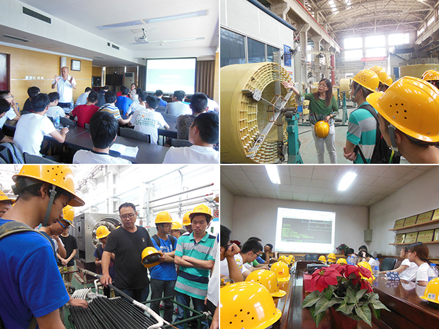 在北京电力设备总厂有限公司的实习,首先安排了企业发展、企业文化、产品质量管理和入厂的安全教育等讲座。随后,班级同学分两组轮流到电机分厂、电抗器分厂和变压器分厂进行工程认识实习。在各分厂的实习,都由技术主管先进行基本知识、产品应用介绍,然后再到现场进行生产工艺过程、产品结构讲解,理论与实践相结合,同学们通过与技术人员、工人师傅的交流,了解了企业的产品、生产工艺、用户和市场销售情况,对行业情况也有了一定认识。