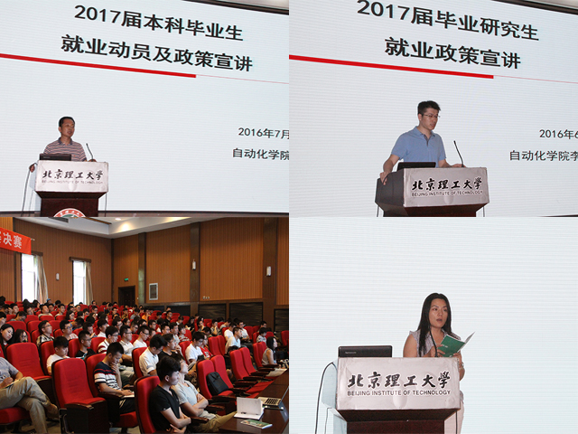 金军代表学院做了就业动员讲话,他客观分析了在经济下行压力背景下,大学生就业面对的供需不平衡加剧、在京就业难度增大、结构矛盾突出的严峻形势,勉励毕业生要客观理性认识就业形势、乐观积极应对求职挫折,早谋划、早动手、早就业。他指出,毕业生要结合学校的育人目标和服务面向,要结合国家经济建设催生的新技术、新业态、新模式来思考个人的职场选择,本科生要积极准备升学,不断提高个人的专业水平和道德素养;研究生要脚踏实地,服务于国防建设和经济建设主战场。同时,他要求学院的就业工作要措施想得更实、工作抓得更紧。