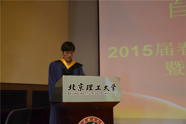 优秀毕业生甘超同学代表全体毕业生发言。他代表同学们向老师、亲友表达了衷心的感谢和崇高的敬意。甘超同学表示,前辈们顽强拼搏、真诚奉献的光辉事迹让同学们深受鼓舞;老师们严谨的治学态度、高深的学术造诣、勤奋进取的工作精神以及为人师表的高风亮节,让同学们受益终身;全体毕业生将不忘理工人刻苦钻研的精神,为国奉献、追求卓越,为实现中华民族的伟大复兴的中国梦而奋斗!最后他代表全体毕业生表达了对母校和老师们的衷心祝福。
