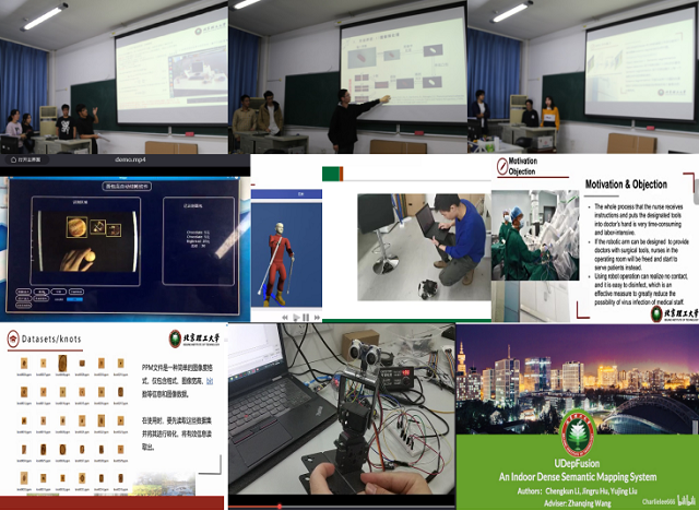 2017级全英文教学班工程创新设计实践分两阶段,第一阶段自2019年10月至2020年1月,在此期间同学和指导老师通过双选方式组成项目组,每个项目组2到4人,在指导老师的带领下展开实施了“滑雪过程人体姿态采集、复现与分析”、“无人船障碍物检测系统设计”、“基于图像和语音识别的手术辅助机器人”、“基于视觉的面包店无人结账系统”、“智慧实验室”、“木材缺陷检测系统”、“基于视觉SLAM家居机器人路径规划”、“基于决策树改进的人工势场法的路径规划方法”、“基于单目视觉传感器的定位导航系统”等9个项目。这些项目涵盖数学、物理等基础课程知识;模拟电子技术、数字电路技术、微机原理与接口、单片机设计等专业基础课程知识、自动控制原理专业课知识;以及神经网络深度学习和SLAM导航等热点技术。在项目的实施过程中,学生需掌握应用所学知识实现并解决实际工程问题的技能,比如电子线路系统设计、机械设计、程序设计、常用仪器仪表使用等。同时,学生要利用各种设备或被控对象模拟实际工程问题并实现工程设计。此外,这门课程还强调其它诸如自主学习、项目管理、团队合作、独立分析问题和解决问题、演讲与展示、论文撰写等技能的培养。