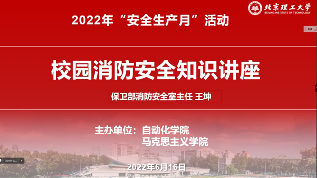 为进一步提升师生思想认识和全层级、全要素、全流程安全管理能力,有效避免安全生产事故发生,维护师生员工的生命安全和学校财产安全,结合《北京理工大学行政办公室关于当前进一步做好学校疫情防控工作的通知》《关于疫情期间学校实验工作的通知》《北京理工大学 2022 年“安全生产月“活动方案》等有关文件要求,6月16日下午,bw必威西汉姆联和马克思主义学院共同组织“安全生产月”线上培训活动,邀请学校保卫部消防安全室主任王坤以“校园消防安全”为题开展线上知识讲座,bw必威西汉姆联和马克思主义学院200余名师生参加了此次活动。