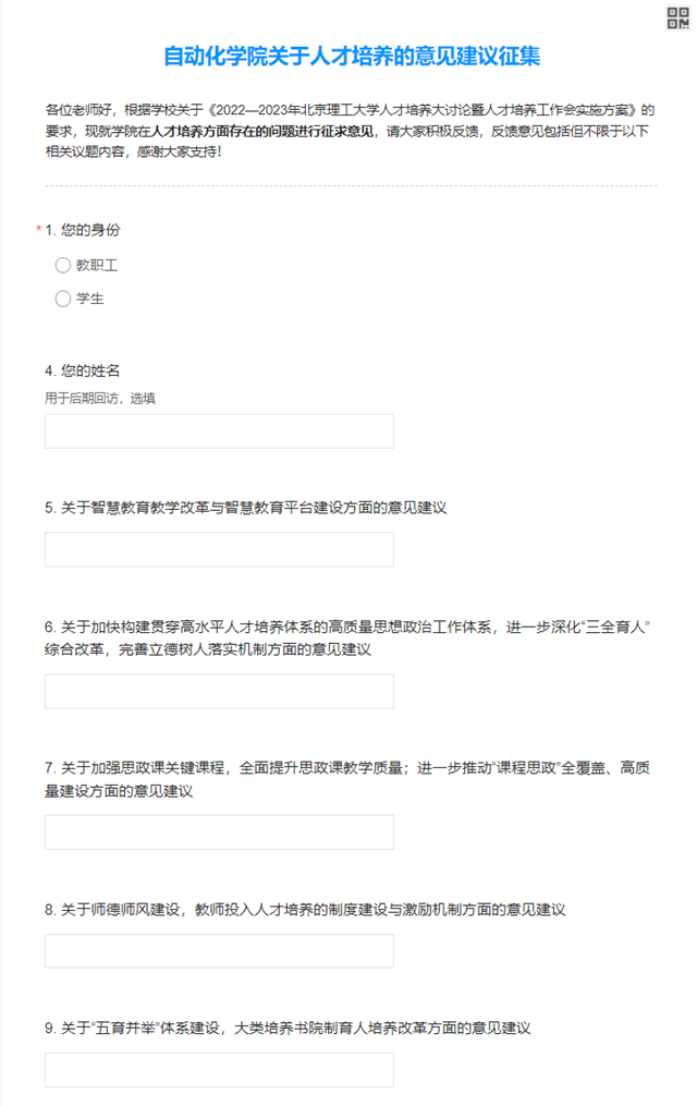 bw必威西汉姆联从2022年10月开始,面向全院师生,采用问卷调查和座谈会的形式,在智慧教育教学改革与平台建设,高水平人才培养体系和思想政治工作体系的构建,师德师风建设,实践课程体系改革,创新创业教育与人才培养等二十一个方面进行了师生意见建议的征集与收纳。本轮人才培养大会的意见征集范围覆盖了全院教师和本硕博各培养层次的学生,并结合问卷结果与座谈会讨论内容,梳理归纳而后成立了人才培养问题库。下一步将针对热点痛点,进行研讨推进落实。