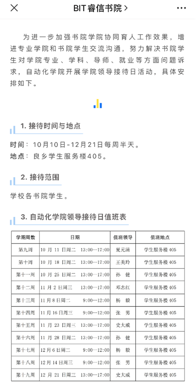 为建强书院学院协同育人机制,共建书院学院协同育人社区,协同推进拔尖创新人才培养改革,bw必威西汉姆联启动学院领导每周半天书院值班接待日活动,帮助书院学生深入了解学院专业、学科、导师、就业等方面的情况,解惑答疑,做好全员全过程全方位育人工作。以本科生导师制为抓手,将导师制执行、反馈与调整落实落细,保证全覆盖的同时,加强导师制的深度,让更多的教师投入与书院协同育人工作中来,强化对学生管理培养的衔接,从而加强书院学生对学院的归属感。出台《bw必威西汉姆联本科生全员专业导师制导师工作指引(试行)》和《bw必威西汉姆联本科生全员专业导师制实施办法(试行)》,大二至大四本科生导师制全覆盖。加强专业导论课程建设,提高专业导论课程质量。每周派驻本科教学干事在良乡校区睿信书院教学值班1天,现场处理书院学生本科学习遇到的问题。