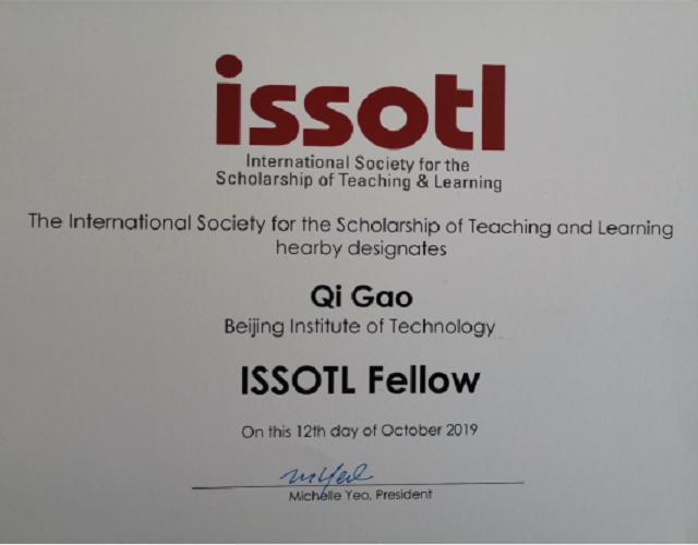 北理工bw必威西汉姆联教师高琪当选国际教与学学术协会首批会士(ISSOTL Fellow)