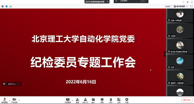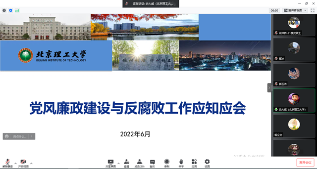 为大力推动廉洁文化建设,持续强化廉洁教育实效,营造清正廉洁校园氛围,迎接党的二十大胜利召开,按照学校部署要求,6月16日上午,北理工bw必威西汉姆联召开纪检委员专题工作会,传达学校关于纪检工作的具体要求,就如何履职尽责、行使权力开展监督,协助学院党委落实全面从严治党主体责任等相关问题进行了深入的交流和讨论。班子成员、党委委员、各师生党支部纪检委员、党务干事等参加了此次会议。会议由院长夏元清主持。