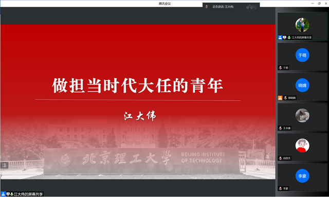 江大伟以“做担当时代大任的青年”为题,围绕青年与时代的关系、习近平的青年观、做担当复兴大任的时代新人三部分内容展开,详细解读了《新时代的中国青年》白皮书的深刻内涵,阐述了不同历史时期中国青年的使命担当,充分展示了新时代赋予青年多元化发展的机遇环境。他带领同学们认真学习了习近平总书记关于青年工作的重要论述,以北理工学子多次在挑战杯、创青春等双创竞赛中取得佳绩为例,强调青年学子在创新创业中展现才华、服务社会的有生力量,指出新时代青年要勇于奋斗、善于奋斗、永久奋斗,为新时代贡献智慧力量、展现青春担当。讲解深入浅出,令人印象深刻。参会学生纷纷表示受益匪浅,收获颇丰。