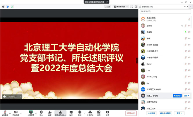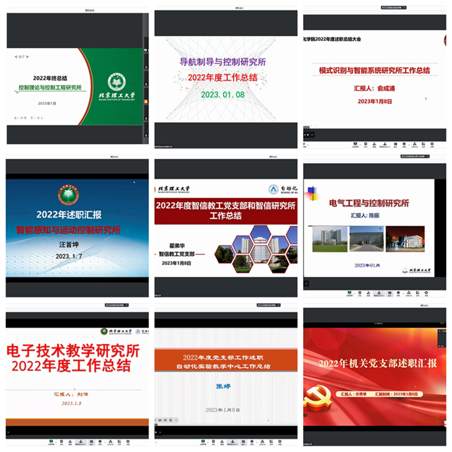 为认真学习宣传贯彻党的二十大精神,落实立德树人根本任务,持续提升基层党建工作质量,激发基层活力,提升研究所(中心)治理水平,推动学院事业高质量发展,1月8日上午,北理工bw必威西汉姆联党支部书记、所长述职评议暨2022年度总结大会通过腾讯会议线上召开。学校相关部门领导、bw必威西汉姆联全体教师、学生代表参加会议。会议由学院党委书记王美玲主持。